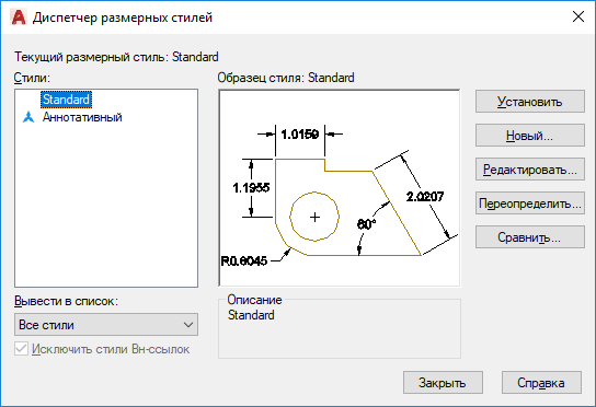 Отображает имя текущего размерного стиля. По умолчанию применяется размерный стиль СТАНДАРТ. Текущий стиль применяется к наносимым размерам.
