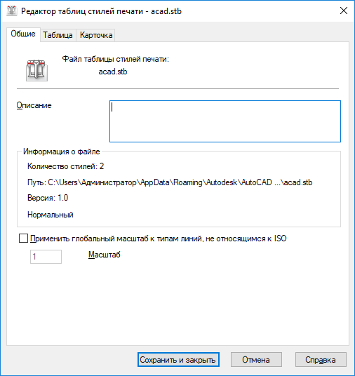 Содержит имя файла таблицы стилей печати, ее текстовое описание, номер версии, местоположение (путь к файлу) и тип таблицы.