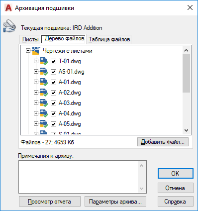 Отображение списка файлов, включаемых в пакет архива, в виде иерархического дерева. По умолчанию в этом списке перечислены все файлы, связанные с текущим чертежом (внешние ссылки, стили печати и шрифты). Пользователь может добавить файлы в упаковку архива или удалить существующие файлы из него. В архив не включаются файлы, ссылки на которые установлены посредством URL.