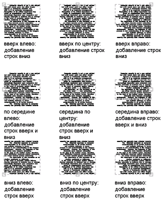 - Задает выравнивание и распространение нового или выделенного текста относительно его границы. К новому тексту применяются текущие настройки выравнивания. Текст выравнивается в пределах заданной рамки согласно настройке выравнивания и на основе одной из девяти точек выравнивания на рамке. Эти точки зависят от первой точки, которая была указана при создании рамки. В горизонтальном направлении текст может центрироваться, либо выравниваться влево или вправо. Пробелы, вводимые в конец строки, учитываются в составе текста и влияют на выравнивание абзаца. Текст может распространяться от середины, верхней или нижней границы абзаца с учетом верхней и нижней границ текста.