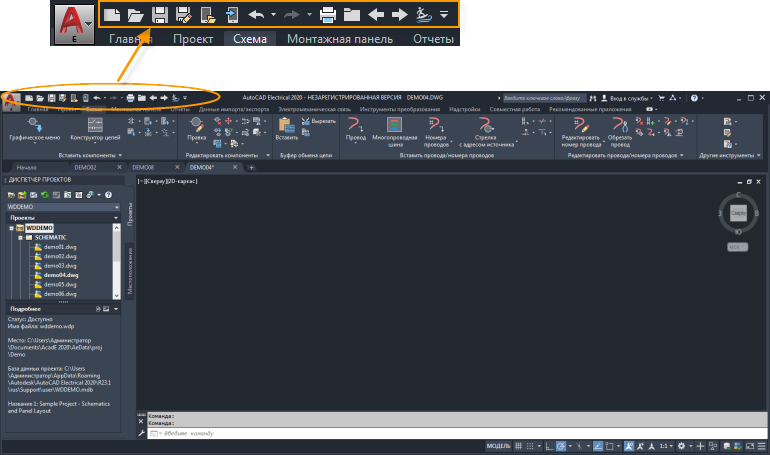 Все функции, описанные в данном руководстве, можно вызвать с помощью ленты. Кроме того, на панели быстрого доступа, показанной на иллюстрации, содержатся некоторые навигационные команды, используемые в AutoCAD Electrical toolset.