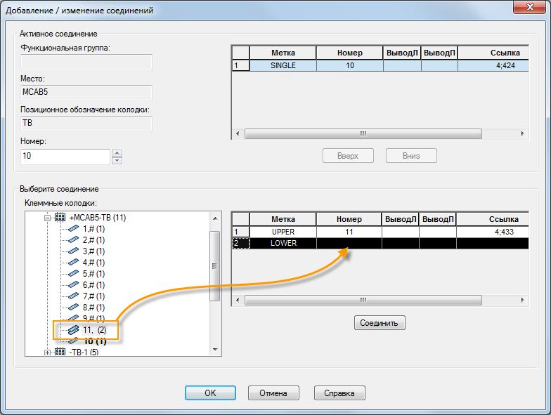 Если клеммы находятся на разных чертежах, нужно изменить клемму, которую требуется связать с другой. Нажмите кнопку "Добавить/Изменить", чтобы открыть диалоговое окно "Добавить/изменить соединения". Здесь можно переместить клемму на открытый уровень другой клеммы.