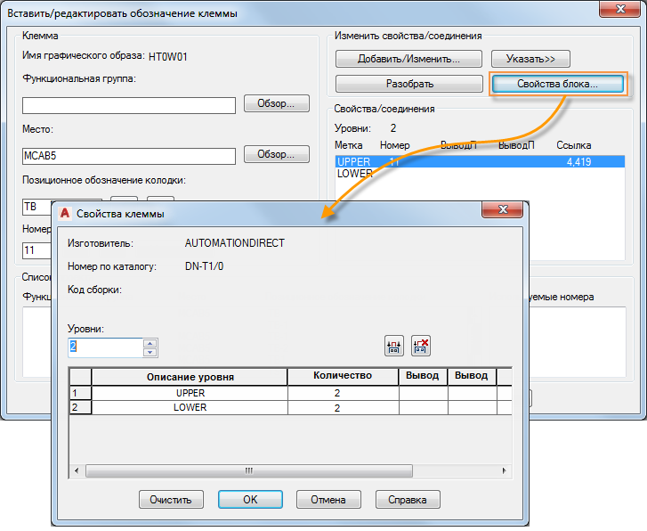 Графический образ клеммы на схеме может обозначать одноуровневую клемму или один уровень многоуровневой клеммы. Количество уровней для клеммы указывается как свойство блока. Каждый уровень содержит некоторые характеристики, такие как метка, количество проводов на соединение, левый вывод и правый вывод. Каждый графический образ клеммы на схеме содержит все свойства блока клемм для каждого уровня, так что удаление одного графического образа клеммы не приводит к удалению свойств блока клемм. При изменении свойства блока клемм выполняется обновление всех графических образов клемм. Графический образ без каких-либо свойств уровня рассматривается как одноуровневая клемма. Свойства клеммы могут быть частью назначения каталожного номера и применяются автоматически при назначении каталога.
