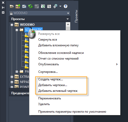 Существующие чертежи можно в любое время добавлять в активный проект. Эта функция полезна, если требуется повторное использование чертежей из предыдущего проекта. Чтобы добавить или создать чертежи в определенной папке, щелкните правой кнопкой мыши имя папки в Диспетчере проектов и выберите необходимое действие.
