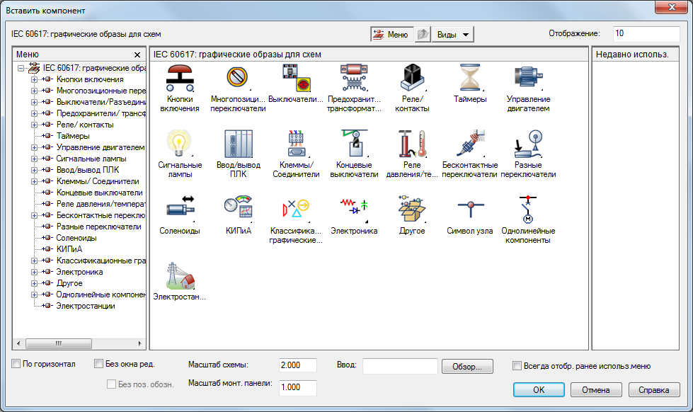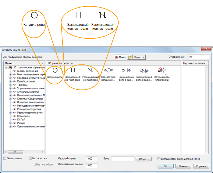 С помощью графического меню можно вставить образ, выбрав его тип, например кнопку включения "ЗАМЫКАЮЩИЙ" или 3-позиционный переключатель. Затем к вставленному графическому образу можно добавить аннотацию, содержащую описания, информацию из каталога и т. д.