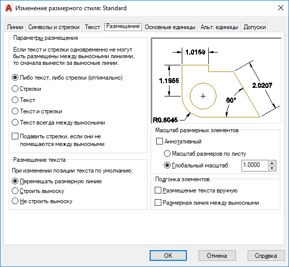 Управляет размещением текста и размерных стрелок между выносными линиями или вне их, в зависимости от расстояния между выносными линиями.