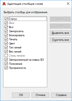 Задает, какие столбцы отображаются в Диспетчере свойств слоев для текущей вкладки "Модель" или вкладки листа.