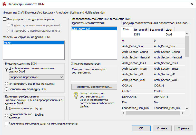 "Стандартные" — это используемые по умолчанию параметры соответствия, которые предполагают извлечение данных из экспортируемого чертежа и автоматическое их сопоставление слоям, типам линий, весам линий и цветам DGN, как показано в таблице просмотра соответствия.