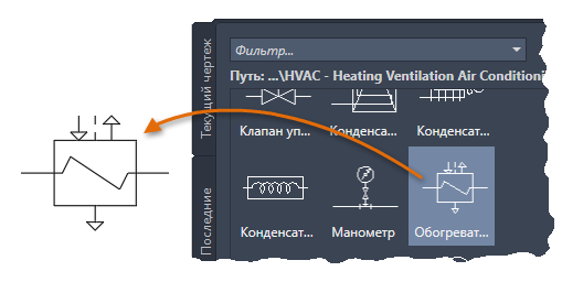 Кроме того, ознакомьтесь с палитрой блоков, щелкнув вкладки «Текущий чертеж» и «Последние».