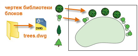 - Одно или несколько определений блоков в файле чертежа. Например, можно создать чертеж, содержащий только определения блоков деревьев, а затем вставить любой из этих блоков в текущий чертеж. Файл чертежа, который содержит семейство связанных блоков, обычно называется чертежом библиотеки блоков.