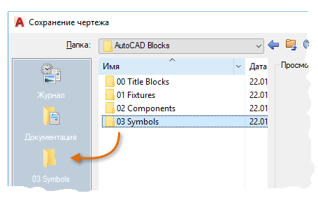 Совет: При сохранении чертежа перейдите к нужной папке, щелкните ее правой кнопкой и создайте несколько папок, чтобы упорядочить чертежи-блоки. Чтобы упростить получение доступа впоследствии, можно перетащить один или несколько чертежей-блоков на панель хранилищ информации.