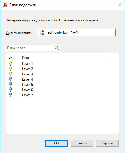 Используйте команду ДВФСЛОЙ, ПДФСЛОЙ, ДГНСЛОЙ или ПСЛОИ или щелкните правой кнопкой мыши выбранную подложку и в контекстном меню выберите пункт "Слои".