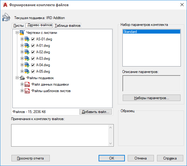Отображение отчетных сведений о комплекте файлов. К их числу относятся заданные примечания к комплекту и автоматически сгенерированные сопроводительные примечания, информирующие о том, как правильно использовать файлы комплекта. Например, если шрифты SHX обнаружены в одном из чертежей комплекта, указывается папка, в которую следует скопировать эти файлы, чтобы их можно было найти в системе, в которой установлен комплект файлов. В отчет также включается текст пользовательских примечаний к комплекту.