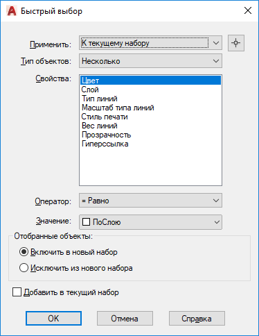 Если установлен флажок "Добавить в текущий набор", критерии фильтрации применяются ко всему чертежу.