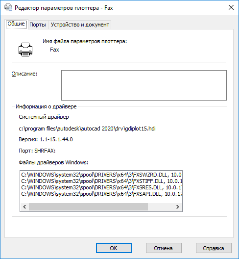 • тип драйвера (системный или несистемный), модель плоттера, путь к файлу драйвера