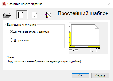Создание нового чертежа, использующего британские систему единиц измерения. При этом размер области рисования (лимиты сетки) по умолчанию равен 12 на 9 дюймов.
