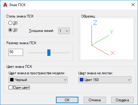 Задание цветов знака ПСК, отображаемого на видовых экранах в пространстве модели и на вкладках "Лист".