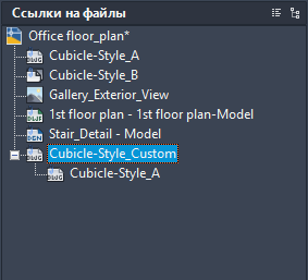 На верхнем уровне дерева всегда показывается текущий чертеж. Файлы ссылок отображаются на следующем уровне. Имеется возможность открывать файлы ссылок, содержащие собственные вложенные ссылки на файлы, и показывать более глубокие уровни. При режиме отображения в виде дерева одновременно можно выбрать только одну ссылку на файл.