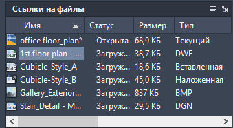 В столбце имени первой записью всегда является имя текущего чертежа, за которым следуют имена дополнительных вставленных файлов, выстроенные в порядке их вставки.