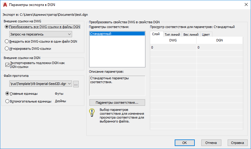 Позволяет выбрать и настроить параметры соответствия, используемые для текущего экспорта в DGN.