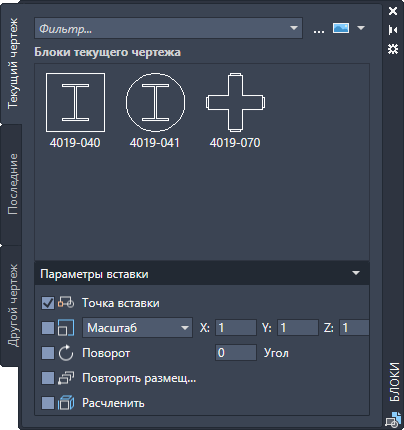 Отображение палитры с вкладками, с помощью которой можно вставить блок или чертеж.