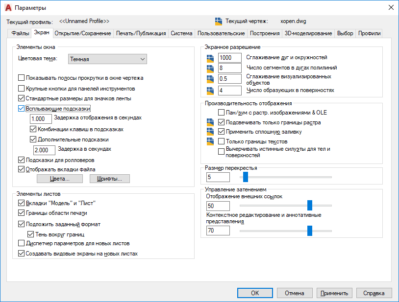 Прим.: Некоторые параметры с этой вкладки недоступны в AutoCAD LT.