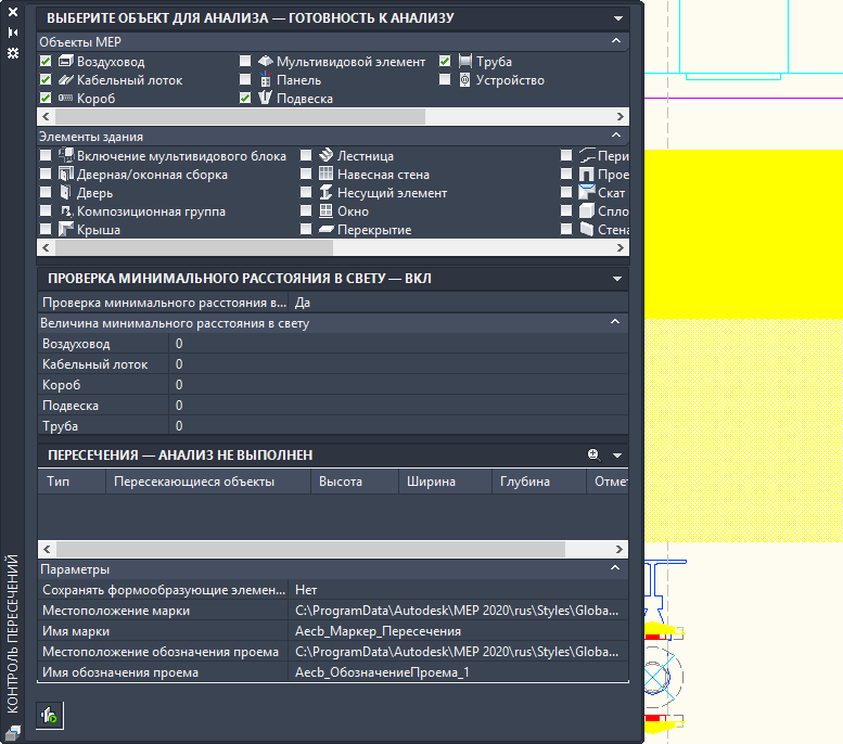 Прим.: Режим анализа пересечений действует отдельно для каждого чертежа. При переключении на другой чертеж палитра контроля пересечений обновляется на основании параметров текущего активного чертежа.