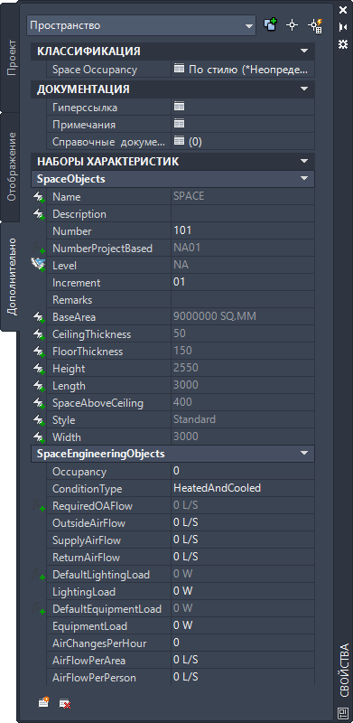| LightingLoad | Величина осветительной нагрузки для помещении. Если в стиле пространства указано значение осветительной нагрузки на единицу площади, то набор DefaultLightingLoad рассчитывает данное значение на основе площади пространства. Это значение можно переопределить: для этого нужно просто ввести новое значение в поле LightingLoad. |