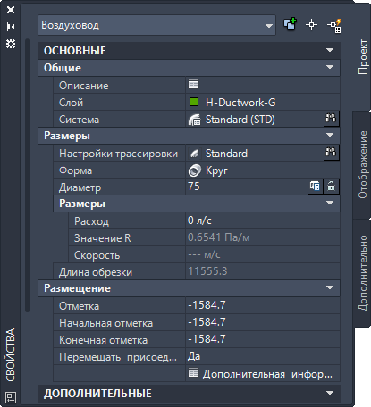 Изменение основных свойств воздуховода с помощью палитры "Свойства".