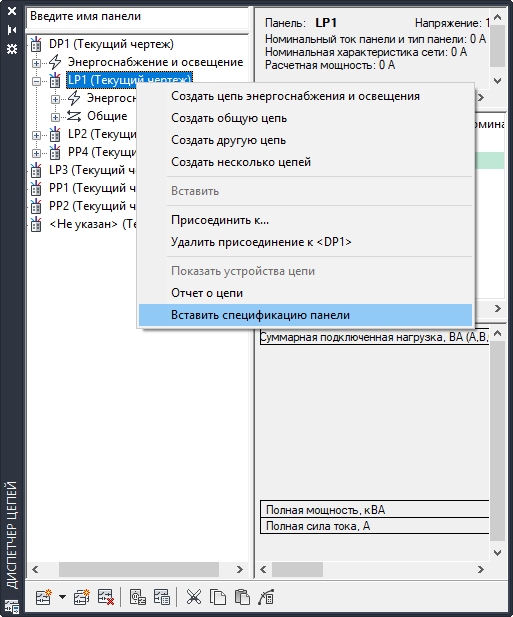 Создание спецификации панели в текущем чертеже с помощью Диспетчера цепей.