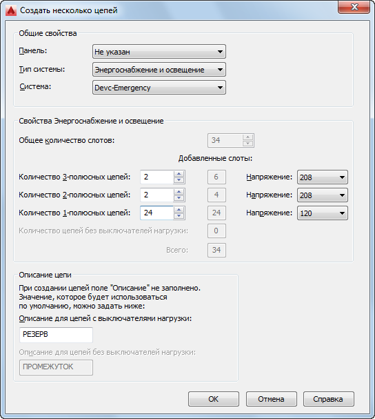 Прим.: После добавления новых цепей обновите спецификации панели в чертеже. Дополнительные сведения см. в разделе "Обновление спецификаций панели".