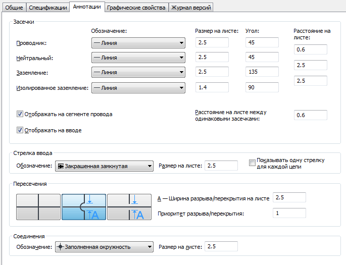 Имеется возможность задать способ отображения пересекающихся проводов: "как есть", с перекрытием или с разрывом.