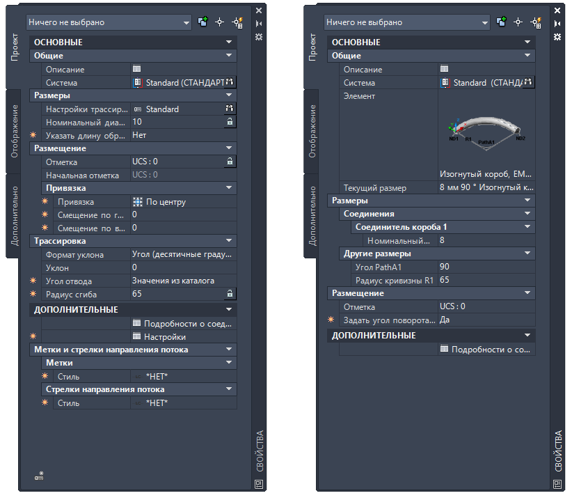 .С помощью палитры свойств короба можно настроить параметры короба и фитингов.