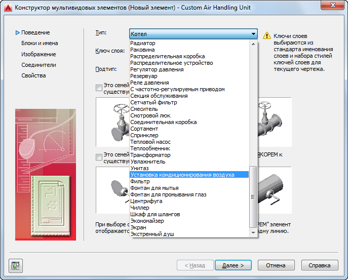 Ключ слоя назначается для семейства элементов в целях автоматического размещения размеров элемента на соответствующий слой. Для всех размеров элемента семейства элементов используется один и тот же ключ слоя. При добавлении к чертежу элемента с заданным ключом слоя элемент размещается на том слое, на который он назначен. Например, согласно стандарту именования слоев Aecb (AecbLayerStd4.dwg) и связанному с ним 256-цветному стилю ключей слоев Mech — AIA ключ слоя "Установка кондиционирования воздуха" создает соответствие со слоем M-HVAC-Eqpm. При добавлении на чертеж установки кондиционирования воздуха она назначается на слой M-HVAC-Eqpm. Для выбора в Конструкторе содержимого доступны только те ключи слоев, которые являются стандартными для стиля ключей слоев, выбранного для текущего чертежа. Дополнительные сведения о ключах слоев см. в разделе .