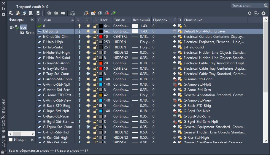 Диспетчер свойств слоев позволяет осуществлять просмотр и управление слоями в текущем чертеже.