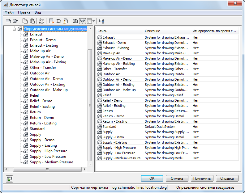 Загрузка систем осуществляется с помощью шаблонов AutoCAD MEP toolset. Если ни один из шаблонов AutoCAD MEP toolset не используется, можно импортировать определения систем из других чертежей с помощью Диспетчера стилей. Дополнительные определения систем содержатся в файле System Definitions.dwg, расположенном во вложенной папке следующей папки: \ProgramData\Autodesk\MEP <версия>\rus\Styles.