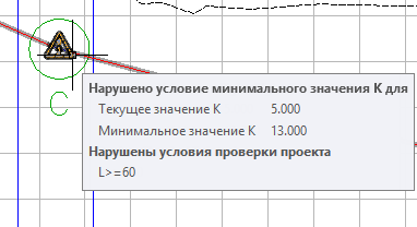 отображается рядом со строкой "Значение K", так как значение нарушает критерии проектирования. В окне чертежа и в виде "Объекты профиля" отображается нарушенная проверка проекта, однако отдельные параметры, которые не соответствуют проверке, не помечаются.