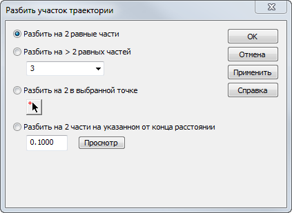 Чтобы открыть диалоговое окно Разбить участок траектории, нажмите Разбить сегмент