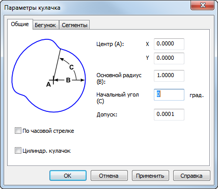 Вкладка Общие содержит опции, которые определяют основные размеры, на которых базируются специальные атрибуты кулачка.