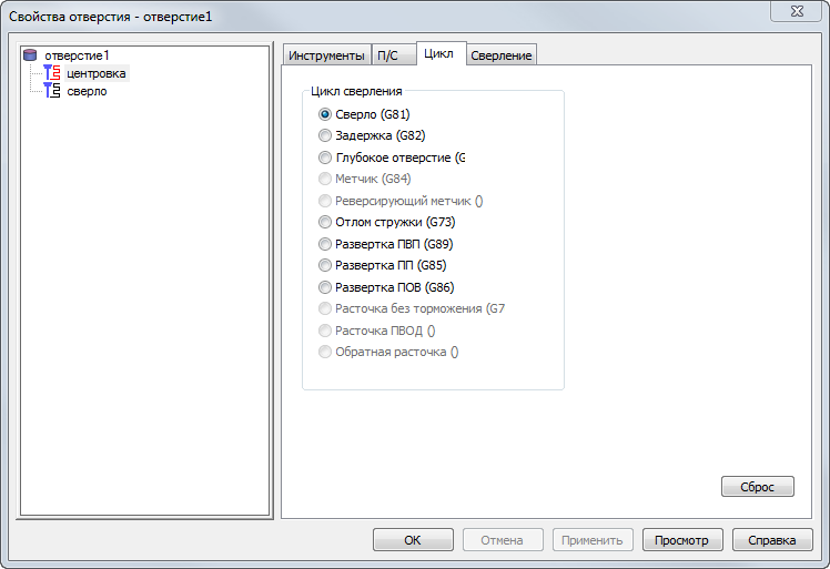 Развертка — Этот цикл влияет на то, как выполняется развёртывание. На выбор даны Развертка ПВП (подача-выдержка-подача) (G89), Развертка ПП (подача-подача) (G85) и Развертка ПОВ (подача-остановка шпинделя-вывод) (G86).