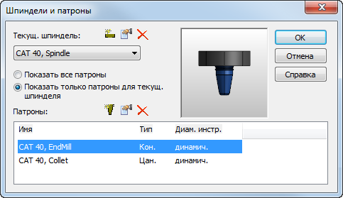 Диалог Шпиндели и патроны показывает текущий шпиндель и патроны, которые определены для него. Чтобы сменить текущий шпиндель, выберите шпиндель из списка Текущий шпиндель. Выберите патрон, чтобы показать комбинацию шпинделя и патрона в окне просмотра.