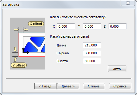 Можно использовать диалог Заготовка, чтобы задать размер и положение заготовки: