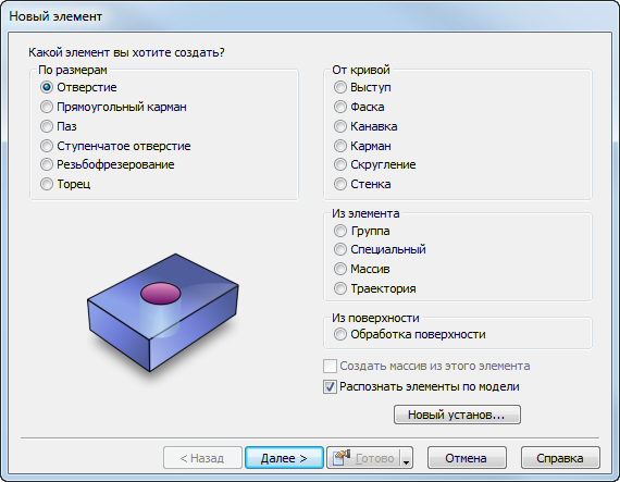 - Если у вас больше одной операции, нажатие на кнопку Далее откроет страницу Новый элемент - Инструмент по умолчанию для следующей операции. Если у вас больше нет операций, то нажатие на Далее откроет страницу Новый элемент - Сводка.