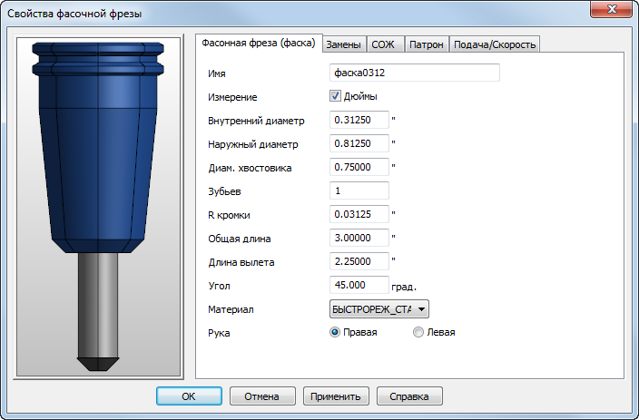 Материал инструмента — указание материала инструмента. Эта информация важна при вычислении подач и скоростей.