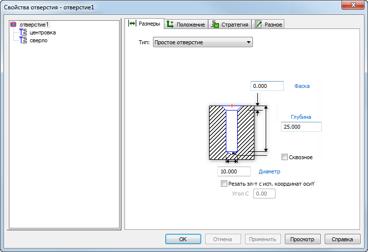 Глубина — введите значение глубины отверстия, не включая кончик сверла, или щелкните синюю метку, чтобы задать глубину в графическом окне.