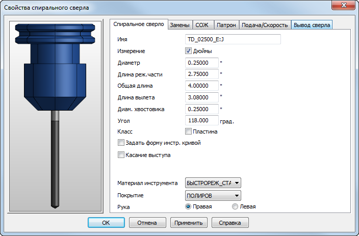 Покрытие — Это покрытие инструмента. Эта информация также используется в вычислениях подачи/скорости. Если существует таблица скорости/подачи для резания материала инструментом с покрытием Полировка, но нет таковой для инструментов с покрытием TI_N или Чёрная оксидная плёнка, то значения скорости берутся из таблицы для Полировки. Скорость для TI_N в 1.5 раза больше скорости для ПОЛИРОВ. Скорость для ЧЁРН_ОКСИДН_ПЛЁНКА в 1.05 раз больше скорости для ПОЛИРОВ. Скорости подач такие же, как скорости подач для ПОЛИРОВ.