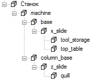 Затем мы должны определить несколько отношений родитель-потомок между различными телами. Картинка ниже показывает первый набор отношений родитель-потомок, который нужно задать. Станок - родитель тела column_base, которое в свою очередь является родителем тела z_slide, являющимся родителем тела quill. Если тело column_base перемещается, то телу z_slide необходимо перемещаться вместе с ним, а если z_slide перемещается, то телу quill необходимо также двигаться вместе с ним.