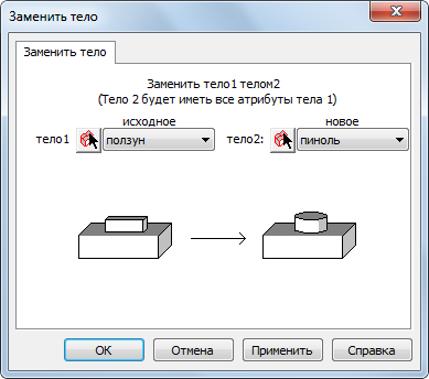 Используйте диалог Заменить тело, чтобы заменить тело1 телом2 и сохранить атрибуты дизайна станка из тела1, такие как отношения 'родитель-потомок', перемещения и так далее.