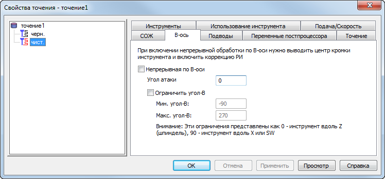 Чтобы использовать непрерывное точение по В-оси, выберите чистовую операцию элемента «Точение» или «Растачивание» в дереве диалогового окна Свойства токарного элемента, затем выберите Непрерывная по В-оси на вкладке В-ось.
