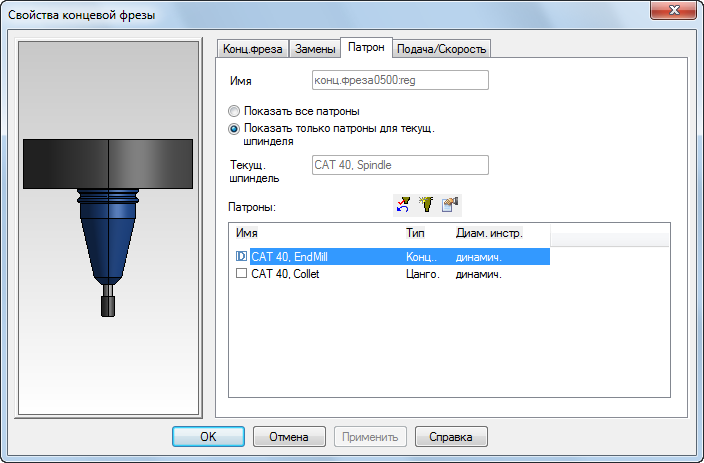 Выберите Показать только патроны для текущего шпинделя, чтобы скрыть патроны, которые не подходят для текущего шпинделя. Выберите Показать все патроны, чтобы показать их все.
